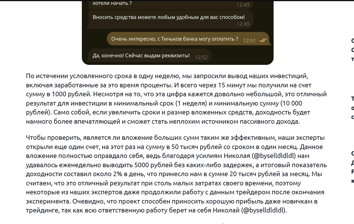 Byselldldldl не сообщает о своей годовой доходности, которая оказаться и отрицательной, и не ведет профильные блоги. Он не рассказывает об управляемых капиталах, вообще не выкладывает никакой отчетности о своей работе. Без нее квалификацию и репутацию финансиста подтвердить сложно.Главная опасность – реклама, которую использует команда аферистов для привлечения клиентов. Это, как правило, псевдоэкспертные статьи, в которых описываются преимущества сотрудничества. Авторы статей рассказывают про совместные заработки, но при этом тоже нет отчетности, по которой можно было бы проверить сделки. Если есть скриншот с переводом – это фальшивка, которую нарисовали в редакторе.