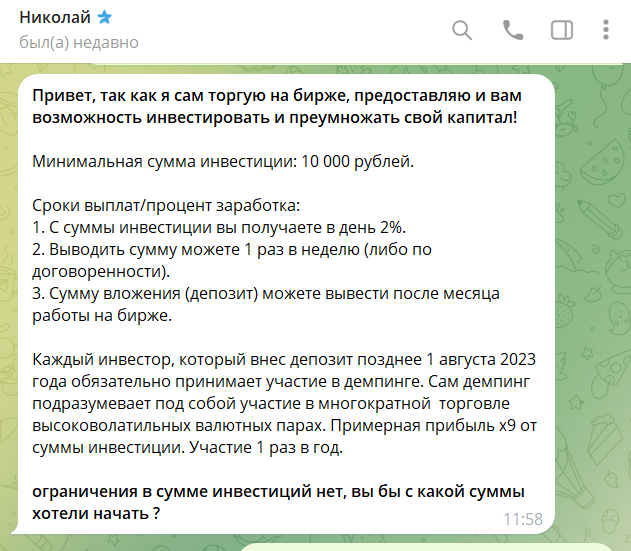 Знакомство с экспертов начинается с рекламных статей. Далее пользователь, который заинтересован в заработках, пишет специалисту, и тот озвучивает условия. Минимальный депозит – 10 тысяч рублей. Заработок – 2% в день плюс ежегодное участие в демпинге, награда за который в 9 раз превышают изначальный депозит. Условия слишком хороши, непонятно, какая здесь выгода для самого Николая.