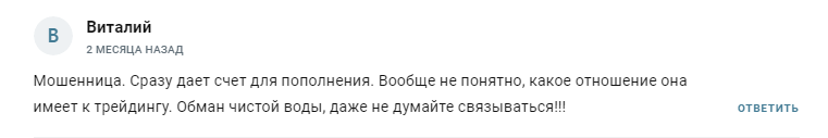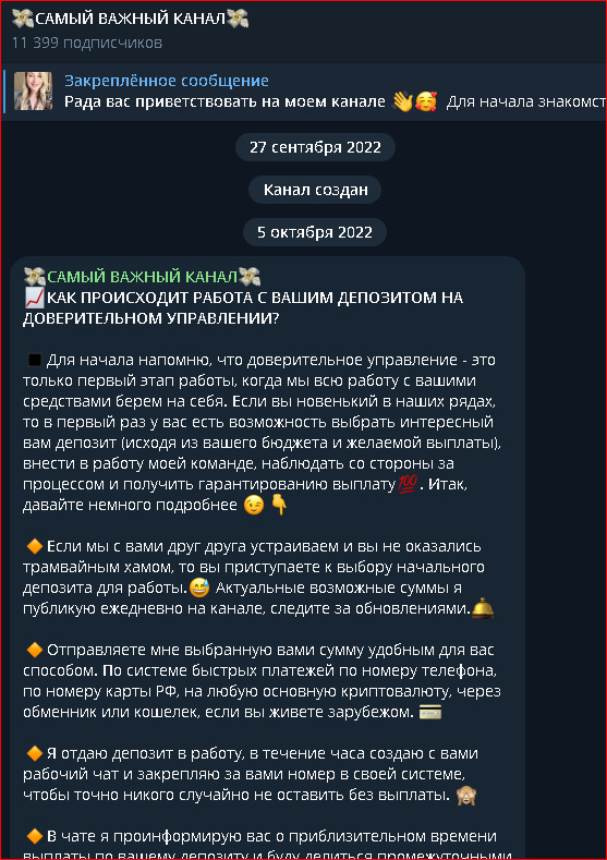 Это обман, как и то, что админ канала действительно торгует криптовалютой. Она разводит новичков, обещаниями сверх прибыли и просит перевести ей деньги на карту для торговли. Как только она их получает, перестает выходить на связь.