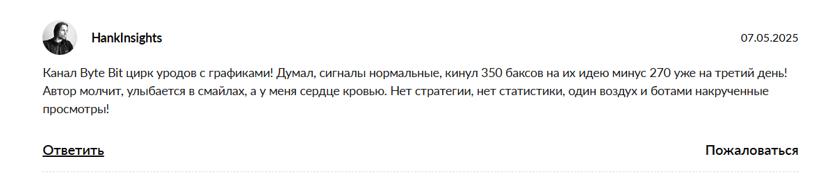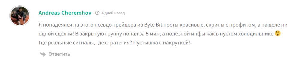 Отзывов о проекте в сети немного. Большого интереса телеграм-канал у подписчиков не вызывает. Это легко объясняется недолгим существованием проекта и бесполезным контентом. Нам удалось найти лишь несколько откликов о Byte Bit и все они отрицательные. Пользователи пишут, что не увидели никакой реальной пользы от канала. Некоторые трейдеры даже открыли сделки по рекомендациям автора, но просто потеряли деньги на них.