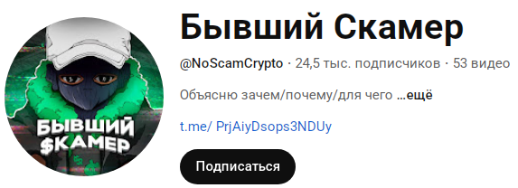 Главной специализацией создателя проекта «Бывший Скамер» является площадка «Ютуб». На хостинге трейдер владеет каналом Noscamcrypto, на который подписано 24 500 юзеров.