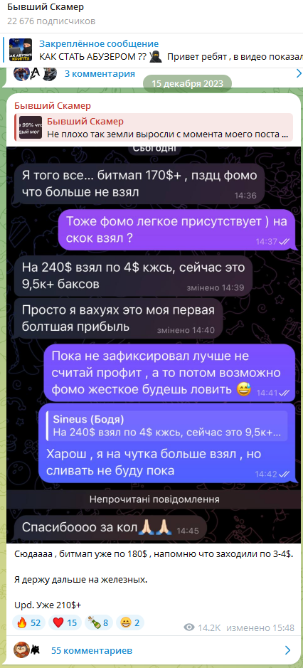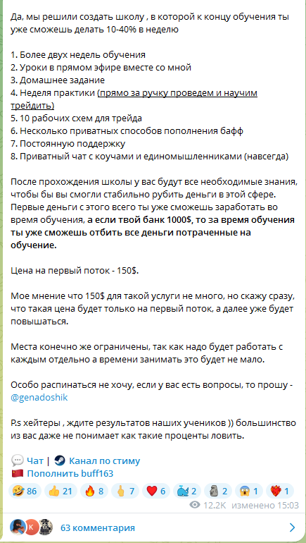 Гена стабильно выходит в плюс и утверждает, что его стратегия формирует положительную репутацию проекта, и позволяет ему делать прогнозы и обеспечивать подписчиков сигналами для успешной торговли. Разработчик TG площадки «Бывший Скамер» демонстрирует в группе по инвестициям названия платформ для заработка криптовалюты. Геннадий заявляет, что сам лично «вытаскивает» их таких порталов деньги. Также он регулярно устраивает торговые сессии, на которые приглашает всех желающих. Кроме этого «скамер» зарабатывает на продаже обучающих курсов. Базовая стоимость подключения к образовательной системе составляет 150 долларов. Опытный финансовый аналитик обещает научить пользователей «абузить» крипторынок и зарабатывать приличные деньги.