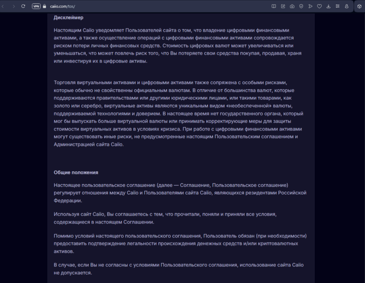 - В правилах пользования Caiio есть формулировки, которые ограничивают права пользователя. Следовательно, риск потерять средства тут довольно большой.