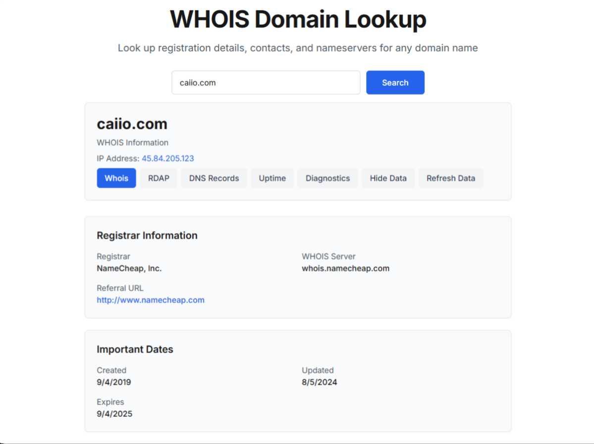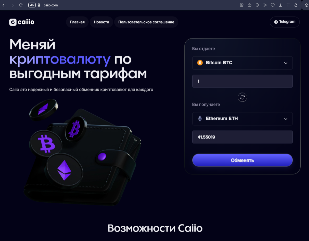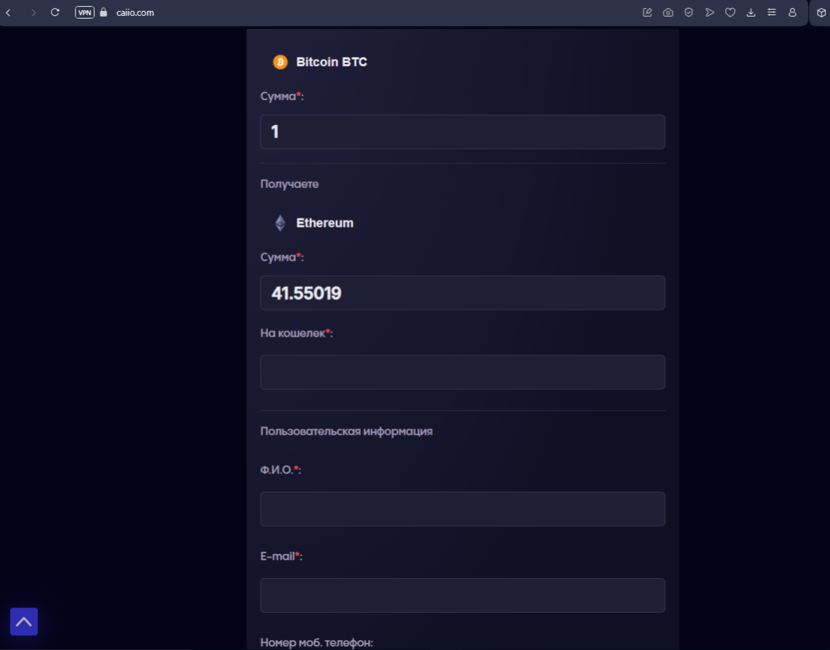 «Саиио» — это сайт, где предлагают быстро и просто менять криптовалюту. На ресурсе обещают выгодные курсы, быструю работу и надежные меры безопасности. Из данных Whois домен Caiio com зарегистрирован в 2019 году, а инфа о владельцах скрыта.