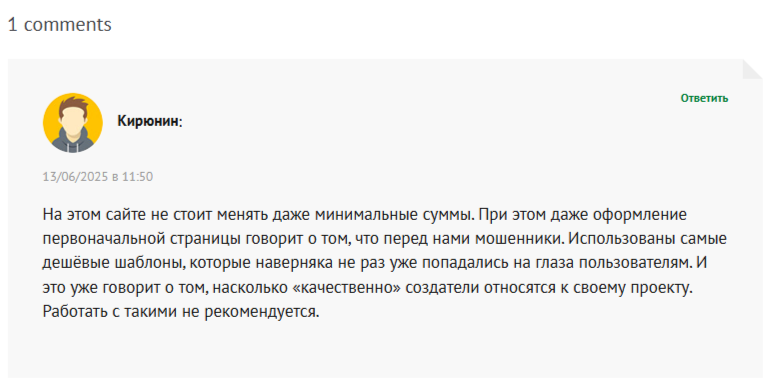 В единичных отзывах пишут, что на сайте обменника не стоит менять даже минимальные суммы. Указывают, что ресурс использует дешёвые шаблоны, а создатели халатно относятся к проекту. Призывают не работать с такими сервисами.