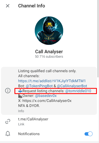 Для прохождения листинга и добавления вашего тгк в базу данных необходимо пройти верификацию у пользователя Tom Riddle.