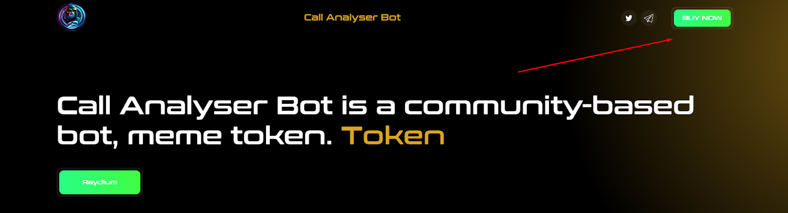 Также там можно заметить ссылку на биржу Raydium, с фразой “Buy Now”, однако никакого конкретного актива для покупки не предлагают, а прямой связи DEX Raydium с Call Analyser нет. Это может ввести невнимательного участника в заблуждение.