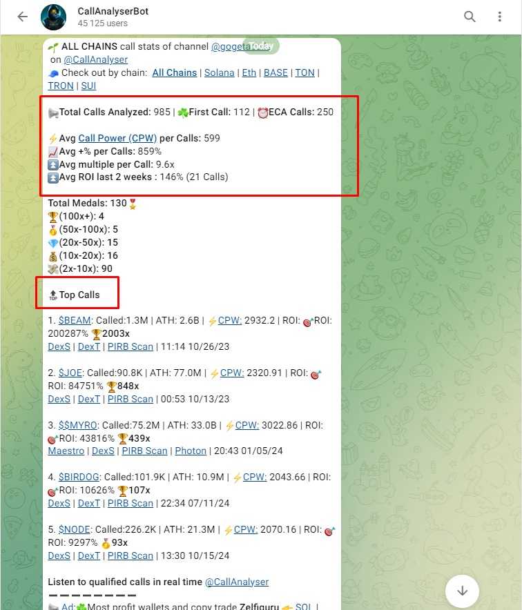 • отбор: по запросу, бот присылает вам только лучшие результаты трейдера, где вы можете увидеть огромное количество иксов, однако это также вводит в заблуждение.