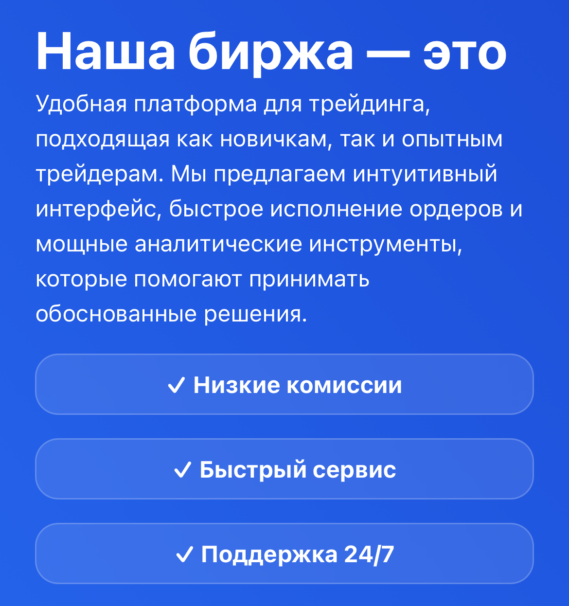 Создатели уверяют, что их биржа подходит начинающим и опытным трейдерам за счет простого интерфейса. Компания обеспечивает клиентов быстрым исполнением ордеров и мощными аналитическими инструментами. Но опять же не сказано какими. Мы не можем удостовериться в правдивости этих слов.