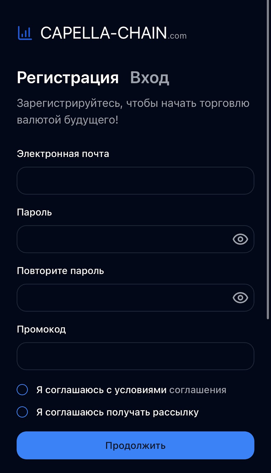 Чтобы узнать о всех факторах финансовых операций на платформе, нужно пройти обязательную регистрацию. Юзера перекидывает на другую страничку с таким же доменом Capella chain com. Для входа потребуются электронная почта и пароль. Но дополнительно можно ввести промокод. Это означает, что сервис приветствует систему реферальной программы. При этом нет возможности узнать о ней подробно до регистрации.