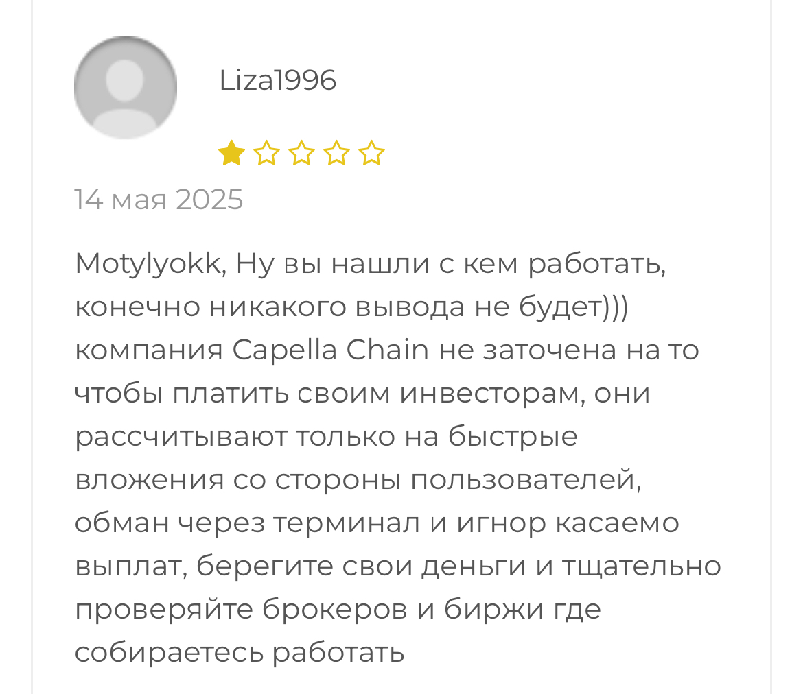 В результате проверки «Капелла Чейн», мы усомнились в надежности проекта. Вот несколько причин: