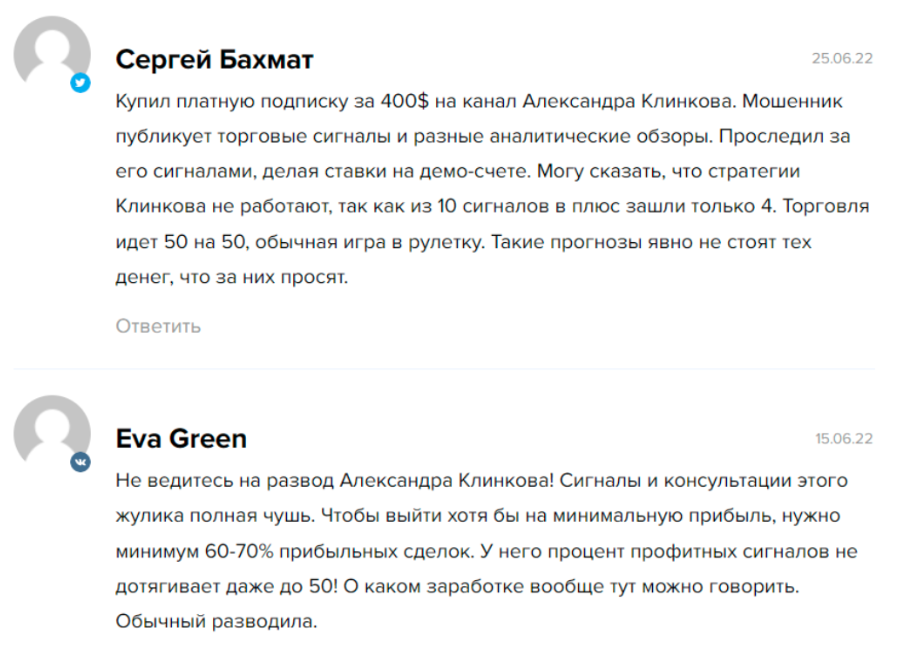 Однако, существует и противоположное мнение О klinkovacademy com. Трейдеры пишут, что торговые сигналы из телеграм-канала «Профессор Клинков» часто приводят к убыткам. Некоторые клиенты называют проект разводом, аргументируя это отсутствием реальной статистики прибыли.