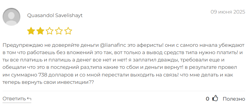 Контактные данные ограничиваются одним аккаунтом под названием lianafinc. Он служит для распространения информации и взаимодействия с пользователями. В описании группы и публикациях указывается учетная запись администратора как единственный контакт для личных сообщений. Отсутствие разнообразия данных усиливает подозрения. Администратор может легко управлять доступом, блокировками и удалением сообщений без надзора.