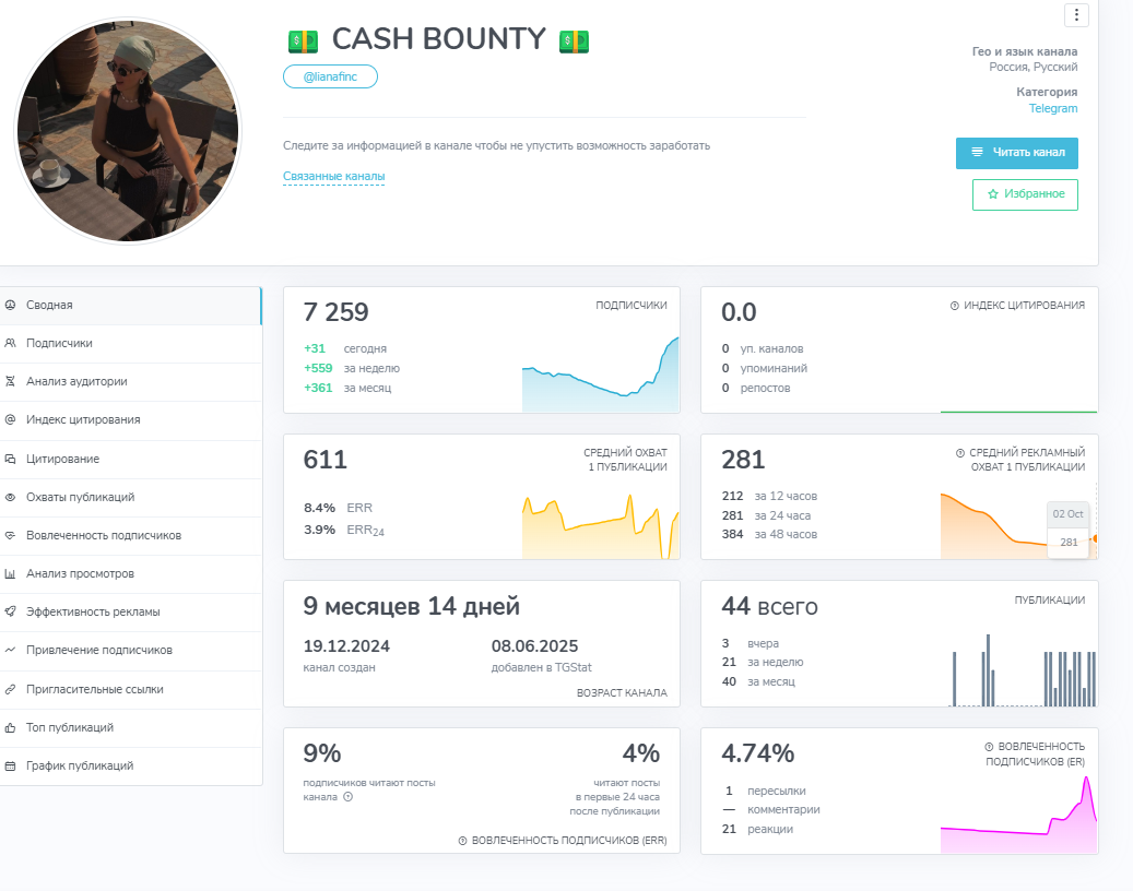 Cash Bounty существует в тг-канале, который доступен для просмотра без необходимости подписки. Его можно найти по названию или через ссылку @lianafinc. Сообщество было создано в декабре 2024 года. С момента запуска оно привлекало аудиторию и достигло примерно 7226 подписчиков. Автором канала представляется человек под именем Анастасия с учетной записью lianafincs. Она указана как основной контакт для взаимодействия.