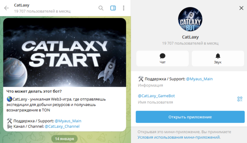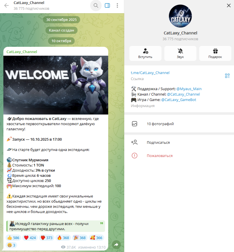 Телеграм-канал CatLaxy Channel был создан 30 сентября 2025 года, но вестись стал спустя 10 дней. За короткое время он набрал 36 тысяч подписчиков. В первом сообщении авторы рассказали, что персонажами их игры являются хвостатые первооткрыватели.