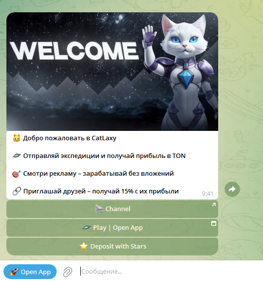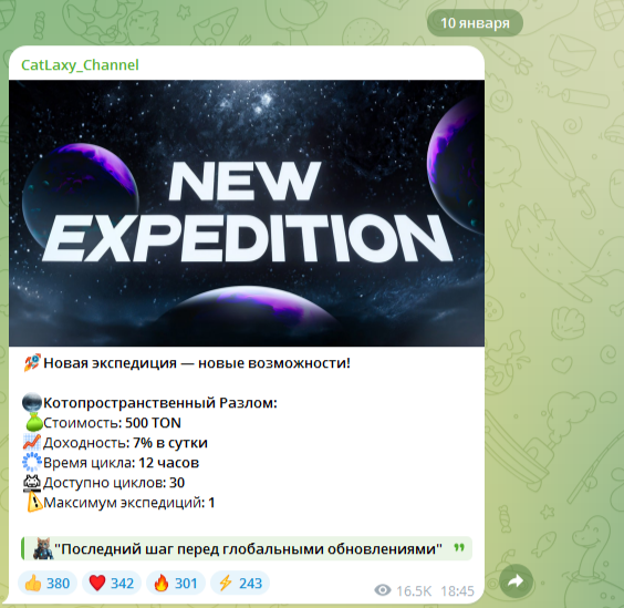 Все это очень маленький заработок, с помощью которого трудно будет заработать даже 1 TON. В телеграм-канале CatLaxy Channel выходят объявления о запуске новых экспедиции. Последняя стоит 500 TON, и приносить она якобы будет доход 7% в сутки.