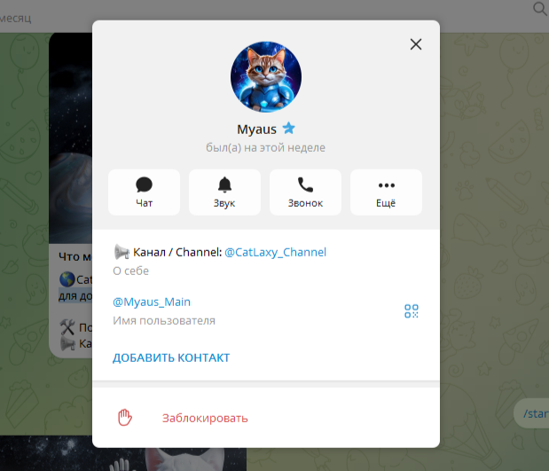 В описании бота нет никаких деталей, кроме той же ссылки на менеджера. Это анонимный персонаж, который в качестве аватарки использует картинку кота и предоставляется как Myaus.