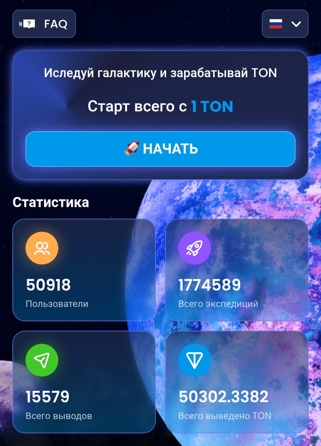 При запуске приложения пользователей встречает статистика проекта. На сегодняшний день к нему присоединилось – 50 918 человек, экспедиций было отправлено – 1 774 589, выводов совершенно – 15 579, выведено TON – 50 302.
