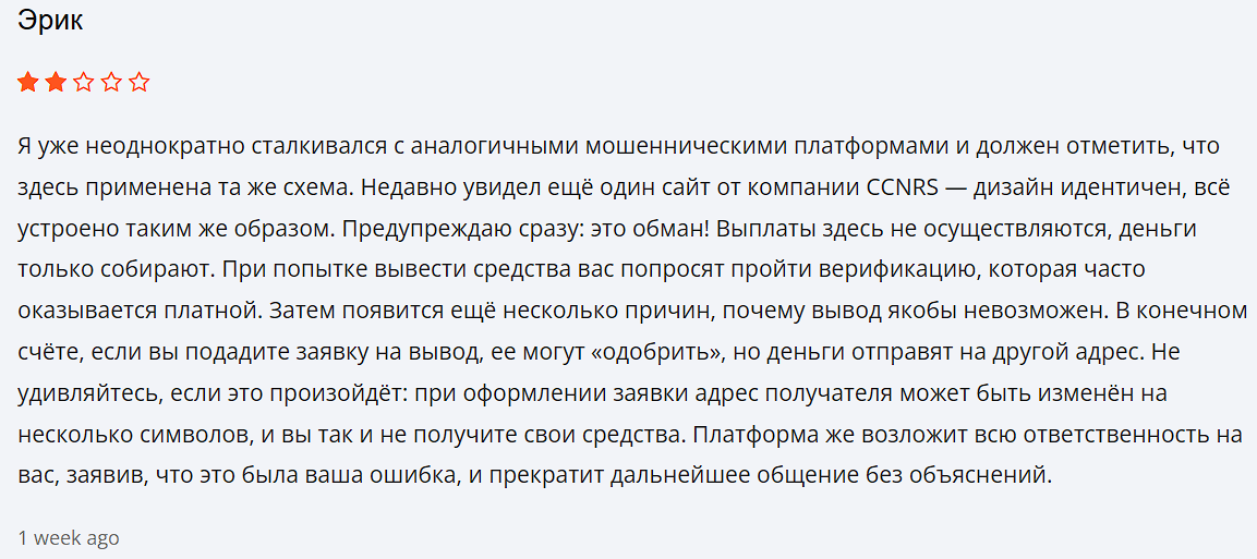 И, судя по отзывам о Ccnrs com, это развод, забрать свои деньги у мошенников невозможно. Аферисты попросту игнорируют заявки на вывод средств, а в техподдержке пользователю сообщают о необходимости пройти платную верификацию, оплатить комиссию за снятие или погасить налог.