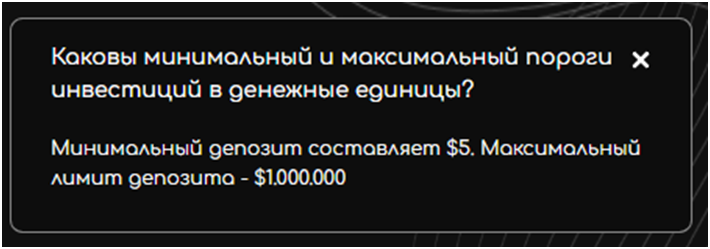Минимальный размер вложений составляет 5 долларов, а максимум на аккаунт можно закинуть около 1 млн долларов.