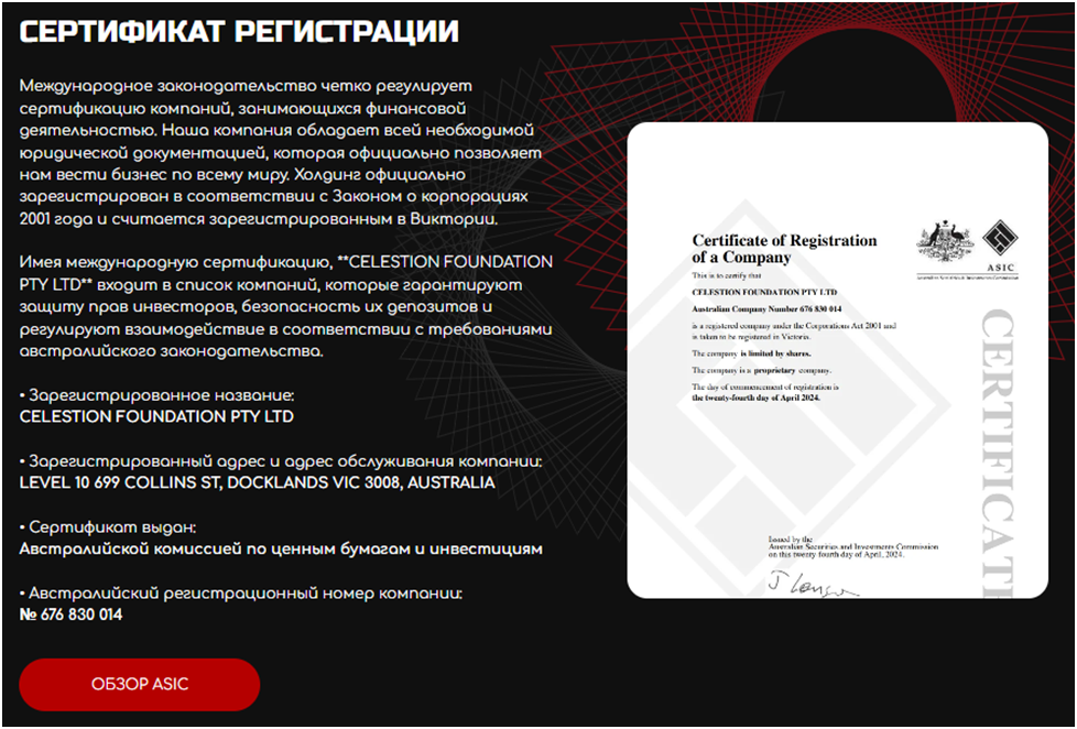 На сайте есть сертификат, который подтверждает, что контора прошла регистрацию в Австралии.
