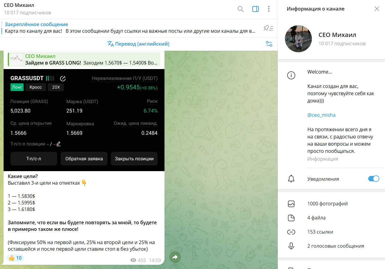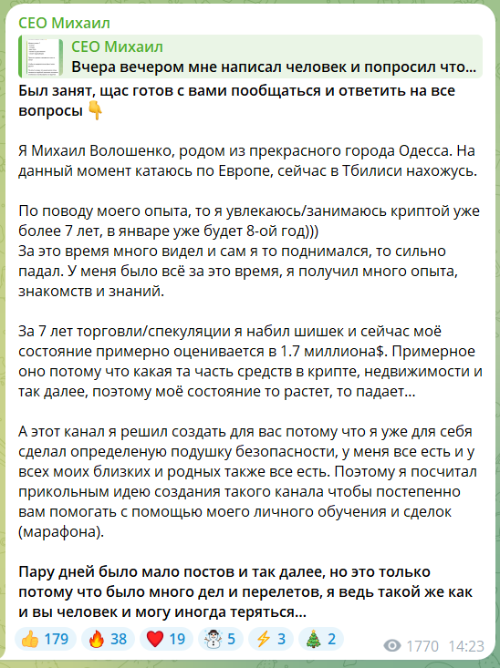 В одном из постов трейдер рассказал о себе. Его зовут Михаил Волошенко. Занимается криптой около 7 лет и утверждает, что управляет капиталом в 1,7 млн долларов. По словам автора, эти деньги находятся в крипте, недвижимости и других проектах. Комьюнити «Ceo Михаил» он создал «для помощи людям». Это не вызывает доверия, так как трейдер не подтверждает опыт и размер инвестиционного портфеля конкретными данными.