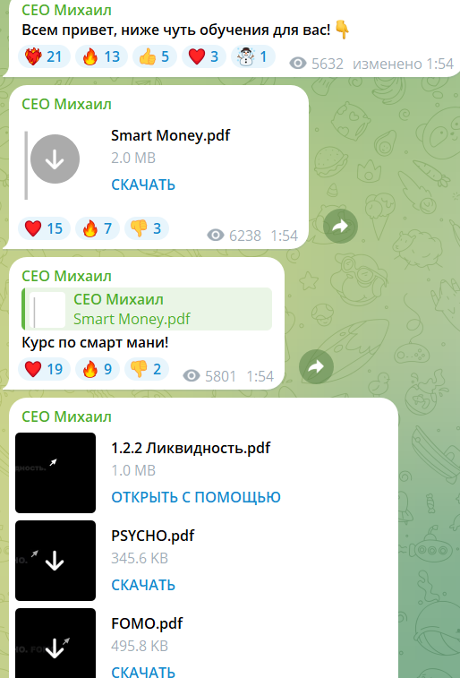 Первыми постами на канале были PDF-файлы с бесплатным обучением торговой стратегии Smart Money. В этом аналитическом методе используется наблюдение за свечами на графике. Трейдеры отслеживают действие крупных игроков: когда они открывали сделки и использовали стоп-лоссы.