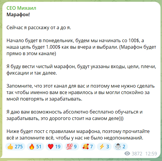 Волошенко запускает в сообществе бесплатные марафоны, в которых показывает, как зарабатывать 1000 долларов с депозитом в 100. Для участия нужно зарегистрироваться на бирже BingX по реферальному коду трейдера, однако это не является обязательным условием.Ежедневно Михаил выкладывает бесплатные торговые сигналы с объяснением точек входа и выхода, а также рассказывает, как их адаптировать под выбранное кредитное плечо. В конце месяца автор делится торговой статистикой. Почти все сделки в ней закрыты в плюс, есть 3–4 в безубыток или убыточные, но отработанные. В среднем трейдер демонстрирует доход от 2000% в месяц. Такой статистике сложно доверять, так как она не похожа на реальную.