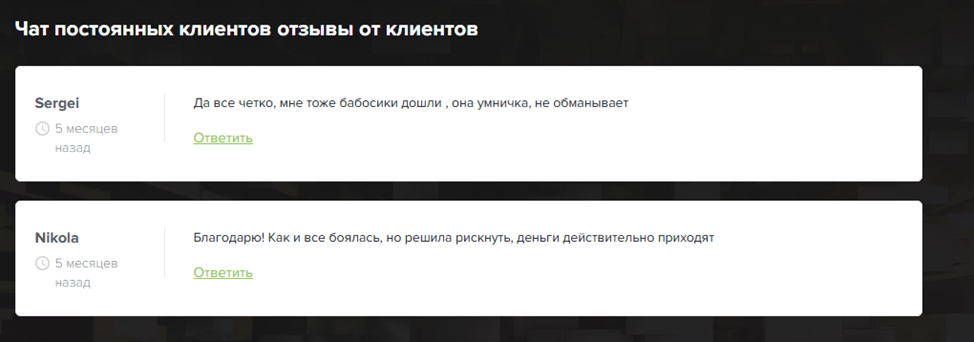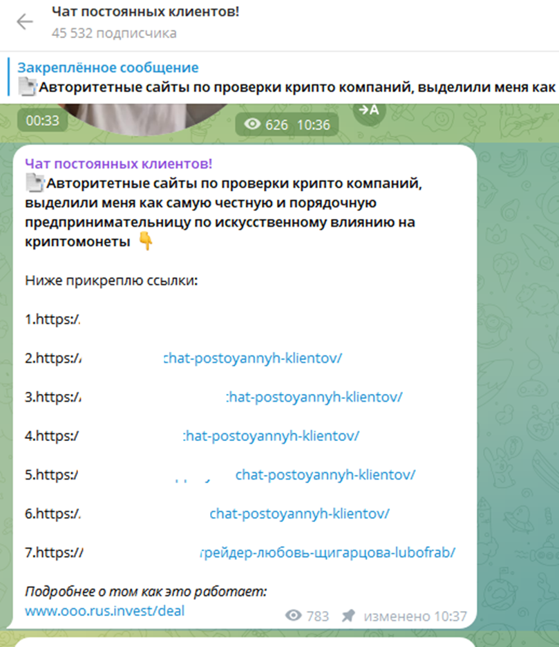 Понимая, что потенциальные инвесторы попытаются проверить деловую репутацию в сети, lubofrab подготовила отзывы и даже заказала рекламные статьи на сайтах, рассказывающих о криптовалютных проектах. Список ссылок с платными публикациями закреплен в шапке канала “Чат постоянных клиентов”. Но даже за деньги большинство порталов не готовы рекомендовать сотрудничество, а лишь бегло рассказывают о трейдере, ее новостной ленте.