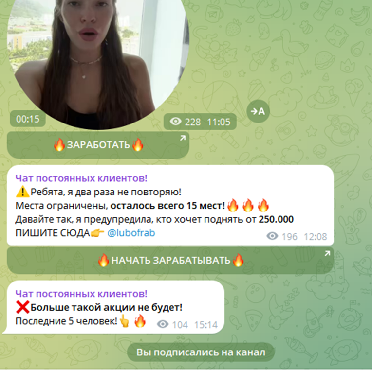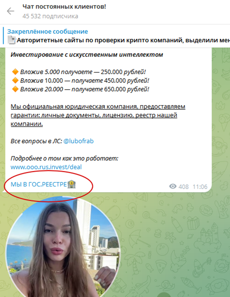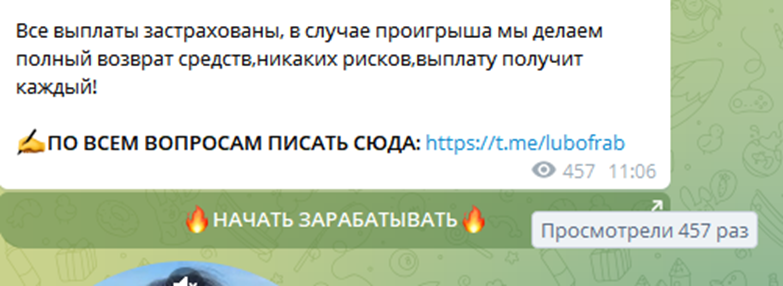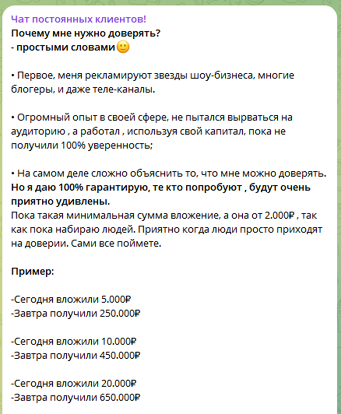 ТГ “Чат постоянных инвесторов” призывает своих подписчиков воспользоваться уникальным предложением – вступить в ограниченную группу, где всего за 1 день пассивного участия можно получить баснословный доход. В постах указывается, что время предложения действует ограниченное время – обычно такой уловкой пользуются мошенники, чтобы клиент не успел хорошо подумать обо всех потенциальных рисках.