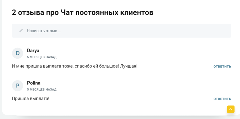 Не учитывая заказные материалы, неверифицированные отзывы о “Чате постоянных инвесторов” в Телеграмме, в сети нет реального фидбека о проекте, что говорит о его небольшой востребованности среди опытных инвесторов.