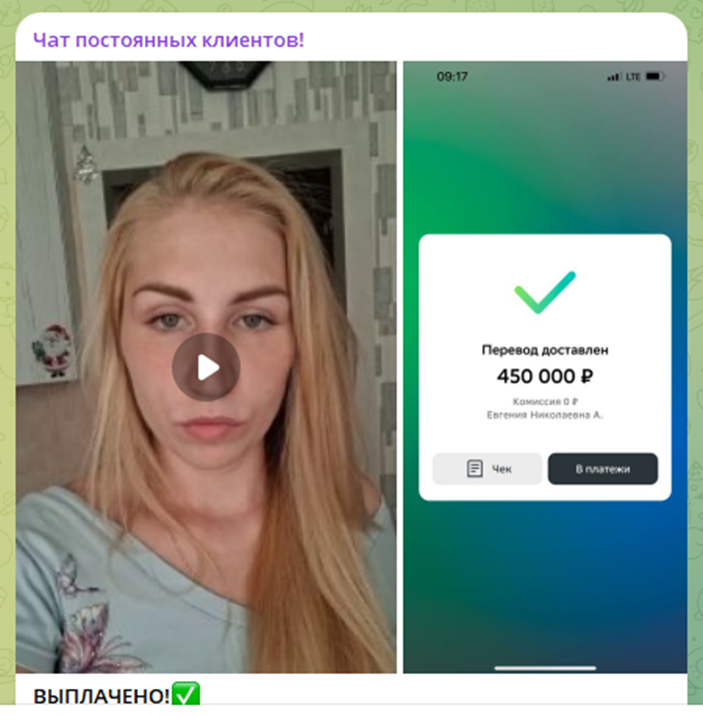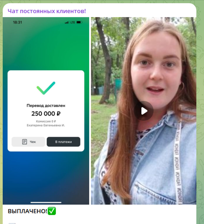На канале “Чат постоянных клиентов” опубликованы отзывы со скриншотами о получении выплат. Некоторые из них сопровождаются видео. Однако, при разборе таких постов, оказывается, что автор ролика не называет трейдера по имени, что может свидетельствовать о его заказном характере – многие готовы снимать такие шортсы за весьма скромный гонорар. Таким образом, нет никаких подтверждений, что кому-либо реально удалось вернуть депозит, а тем более получить прибыль.
