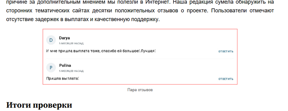 - фейковые отзывы о выплатах;
