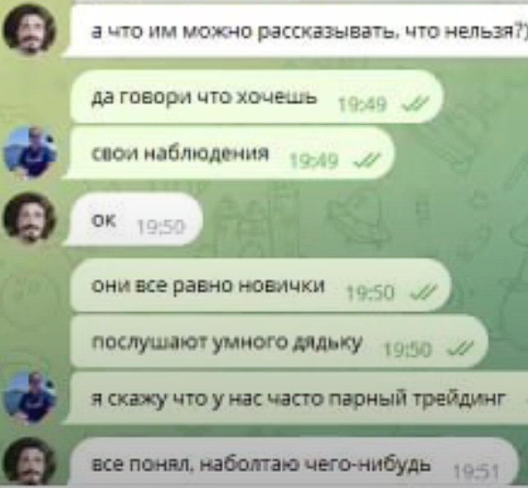 В сети фигурируют скриншоты переписки Aniskevich Dmitry со своим помощником. В ней создатель проекта предлагает рассказывать аудитории «что хочешь», ведь его клиенты — это преимущественно новички. Но даже начинающие трейдеры спустя пару недель осознают, что заработать с сигналами «Честного трейдера» невозможно.