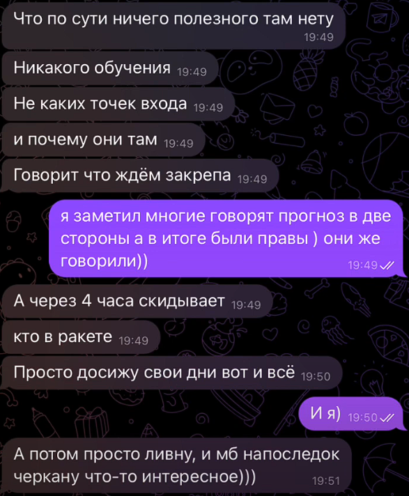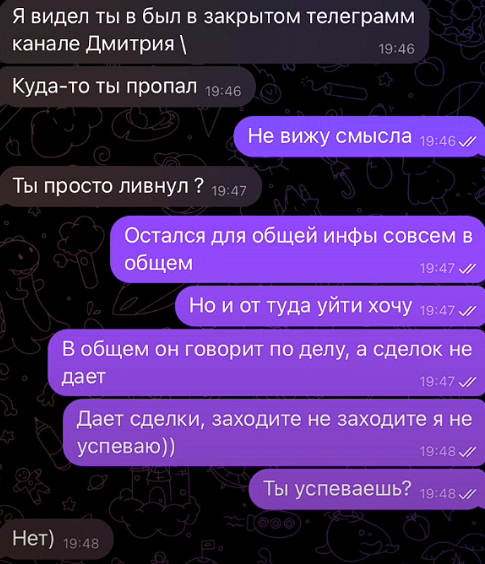 Dimaanis преподносит себя как проверенного специалиста, но в действительности зарабатывает исключительно на продаже подписок доверчивой аудитории. Судя по отзывам о «Честном трейдере» в телеграмм, заработать с Дмитрием Аниськевичем невозможно. Подписчики закрытого канала терпят исключительно убытки.