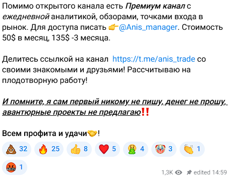 Приобрести подписку предлагается через менеджера Anis Manager. Однако реакции на платные услуги «Честного трейдера» у подписчиков преимущественно негативные, что отслеживается по реакциям под записями.