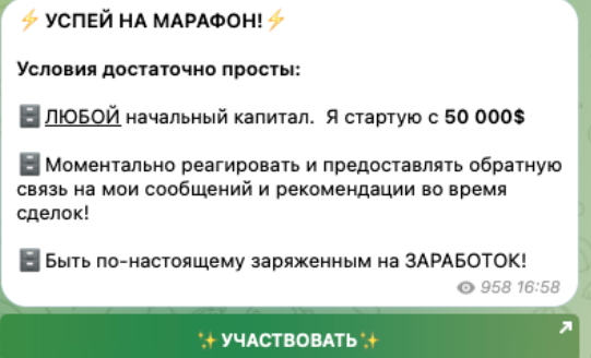 Основной телеграмм-канал автор доступен бесплатно и там трейдер MihaFutures предлагает участие в марафонах, начать которое можно с любого вложения, но лично он торгует, начиная с $50,000. От пользователей трейдер требует моментально реагировать на его советы по сделкам, чтобы получить настоящую прибыль.