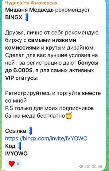 Трейдер рекламирует биржу BingX, оставляет в постах реферальную ссылку и любит обещать самые низкие комиссии и бонусы за регистрацию, а также vip-статусы в системе для самых активных участников.