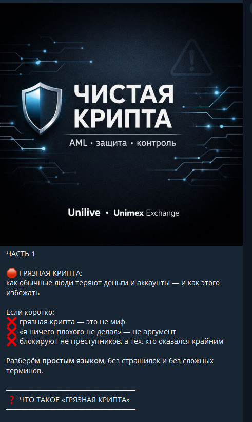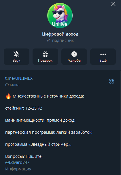 Сейчас админом также активно продвигается биржа UniMex, которая, судя по описанию, интегрирована в соцсеть. Однако торговая площадка тоже не внушает доверия.