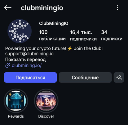 На Clumbmining Io не указано, к кому обращаться за помощью. Есть форма обратной связи. Далее представлена только социальная есть Инстаграм. На нее подписано 16, 7 тысяч человек. Опубликовано ровно 100 постов. Они все новостные. В актуальных историях владельцы отвечают на вопросы клиентов и прислушиваются к их советам и желаниям к обновлениям.