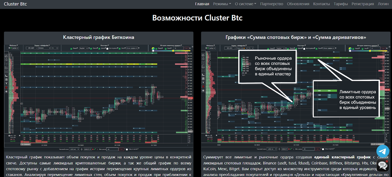 ClusterBTC анализирует более 160 криптовалют с крупнейших бирж, к ним относятся Binance, Bybit, MEXC, OKX и другие. Функционал сервиса: