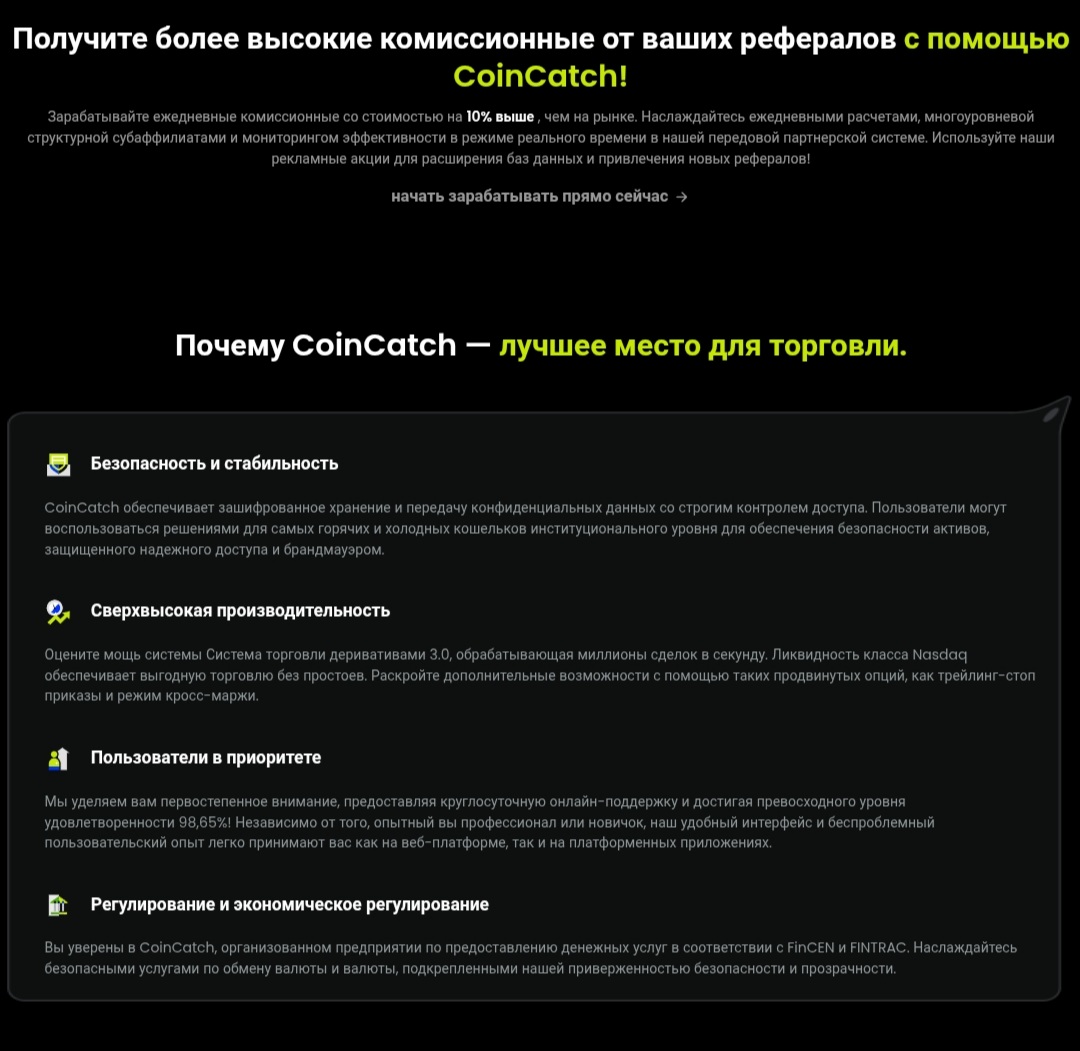 На странице проекта мы прочитали, что биржа Coincatch Com – это лучшее место для торговли. В свои преимущества авторы приписывают следующие пункты: