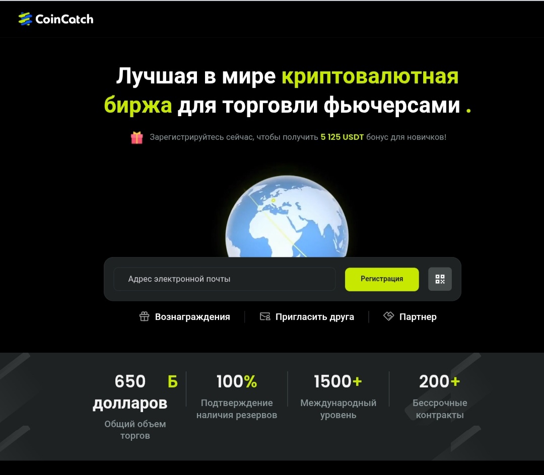 На сайте @ coincatch_official указывалось, что новичкам после регистрации тут выдают денежный бонус в размере 5 125 USDT. Также на первой странице расположена таблица с криптовалютами, которые здесь доступны для торговли.