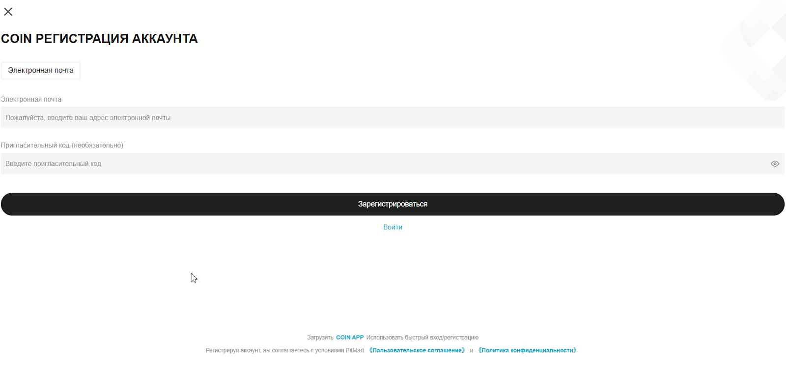 Для регистрации потребуется только адрес электронной почты. В форме для заполнения предусмотрена возможность активировать промокод – но это не является обязательным условием. Судя по всему, создатели биржи практикуют дополнительные выплаты в рамках реферальной программы. Биржа «Коиндо» обещает щедрые бонусы каждому новичку. Однако, подробности проводимой акции не сообщаются. На этапе регистрации трейдеру предлагается ознакомиться с типовыми документами – Пользовательским соглашением и Политикой конфиденциальности. Прописанные положения не являются опорными для сотрудничества с «Коиндо» ввиду отсутствия юридической силы.Во вкладке с доступными тарифными планами нет никакой информации – страница пустая. Уточняется, что инвестиционный проект ведет официальные социальные сети. Однако ссылки, копирующиеся в буфер обмена, также являются пустыми.