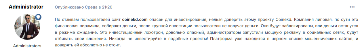 Негативные же комментарии о работе криптобиржи интернет нам предъявил. В таких отзывах о coinekd com компанию называют липовой, финансовой пирамидой, инвестиционным лохотроном.