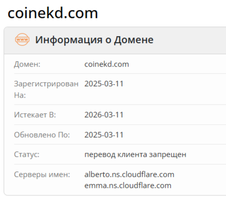 Проверка ресурса помогла выявить, что за сайт coinekd com. Домен был зарегистрирован 11 марта 2025 года. Торговая платформа очень молода и это дополнительно наводит на мысли об отсутствии опыта в торговле или разводе.