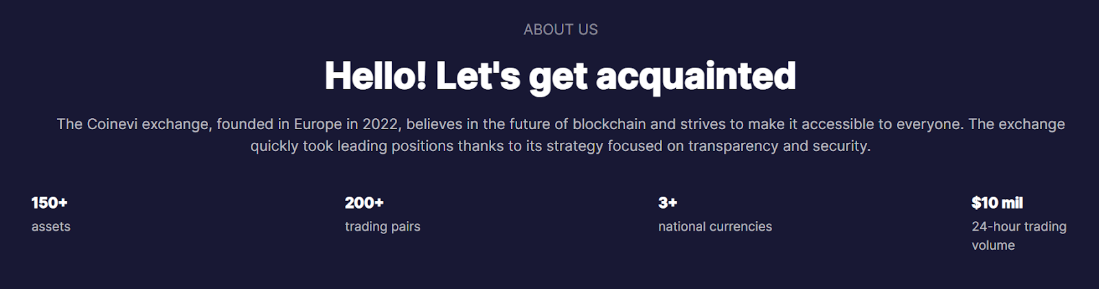 «Коиневи» позиционируется как биржа для новичков и профессионалов, предоставляющая все необходимые услуги и высокий уровень безопасности. Ежедневный оборот тут якобы составляет более 10 миллионов долларов, а пользователям становится доступно более 200 валютных пар. Все это громкие заявления, в которые не верится, исходя из многих других факторов. Биржа Coinevi обладает очень шаблонной структурой, напоминающей прочие недавно созданные сайты, которые уже были уличены в мошенничестве.