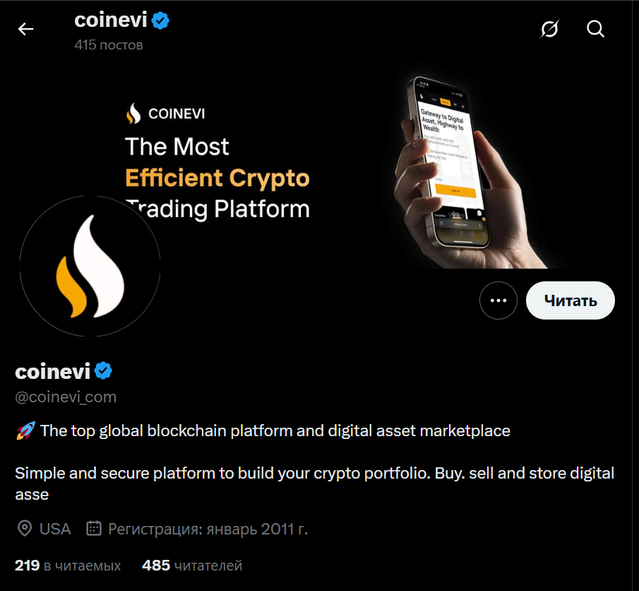 О том, что Coinevi – скам, намекает также страница в социальной сети X. Она существует с января 2011 года, хотя на сайте было заявлено о запуске компании в 2022 году. Посты только за последний месяц посвящены бирже и собирают они около 40 просмотров при 485 подписчиках. Более ранние посты состоят из репостов различных трейдерских страниц. Они собирали более 1 тысячи просмотров.