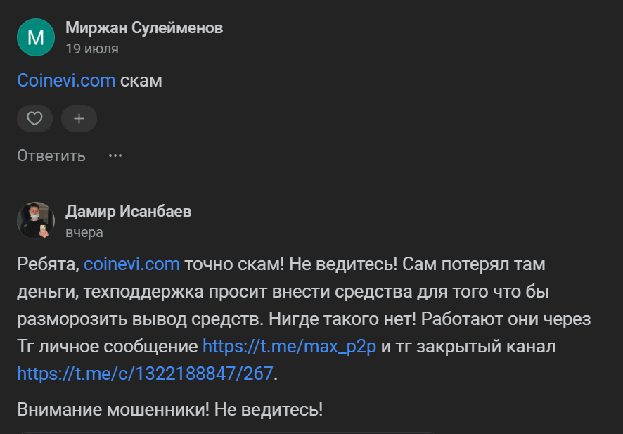 О сайте Coinevi com отзывы только негативные. С учетом короткого срока существования, их относительно мало, но все пользователи пишут, что это скам, с которым лучше не связываться. Люди теряют деньги при пополнении счета и попытке вывести средства. Практически все комментарии встречаются только за последний месяц, а не с 2011 или 2022 года.