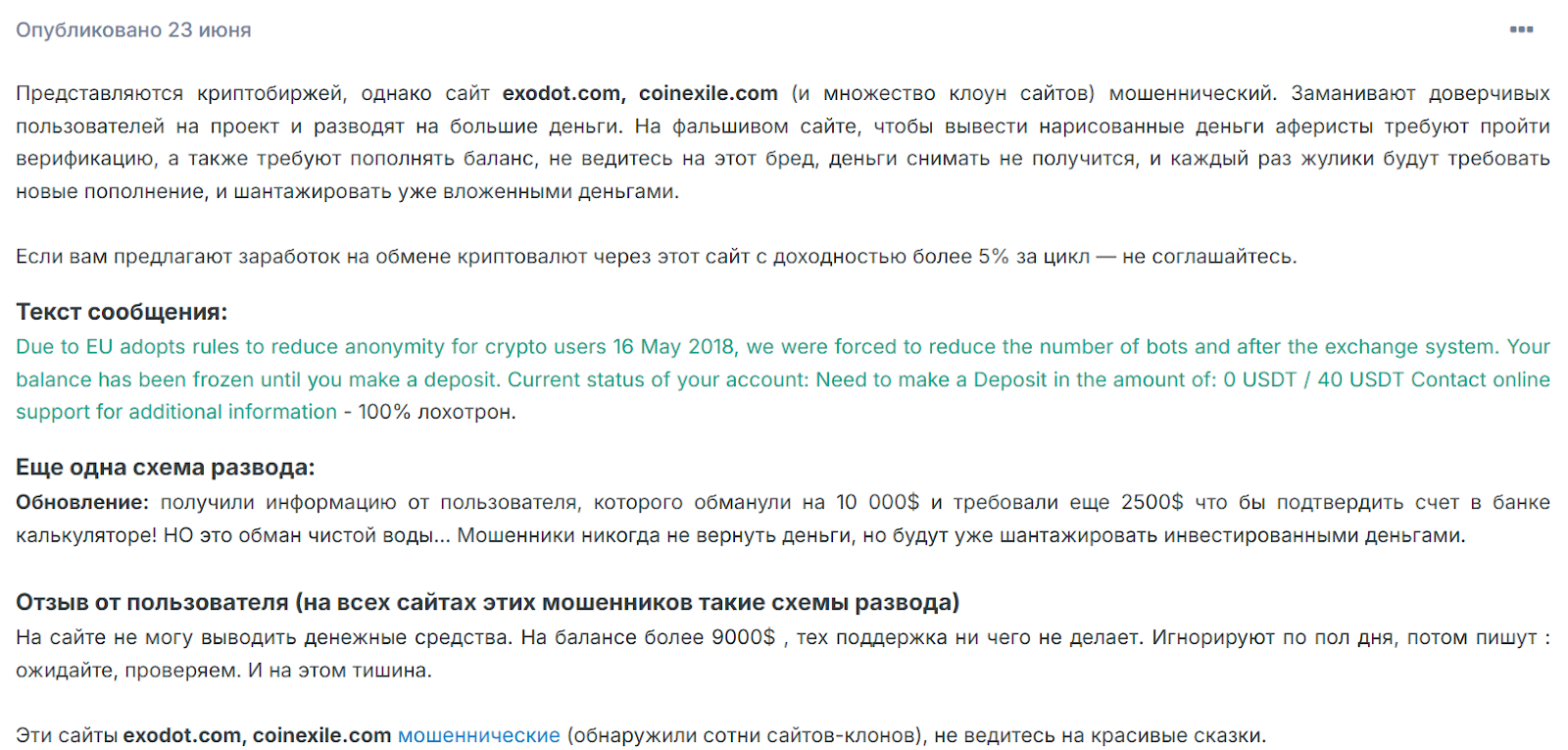 Также есть информация, что сайт exodot com может быть клоном CoinExile, который также используется для привлечения клиентов и проворачивания мошеннических схем.